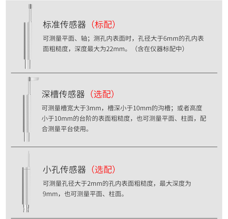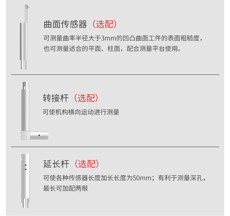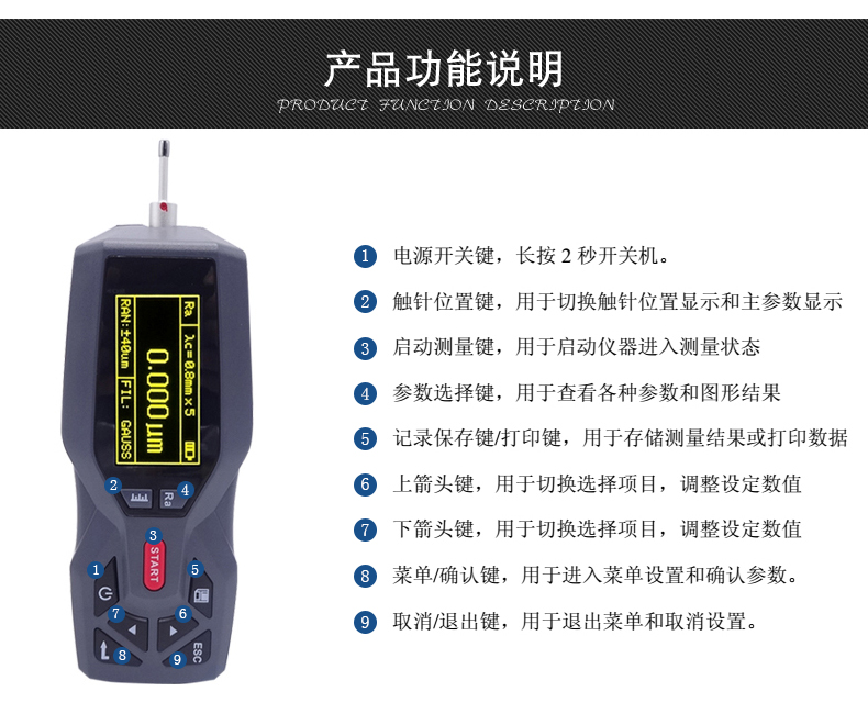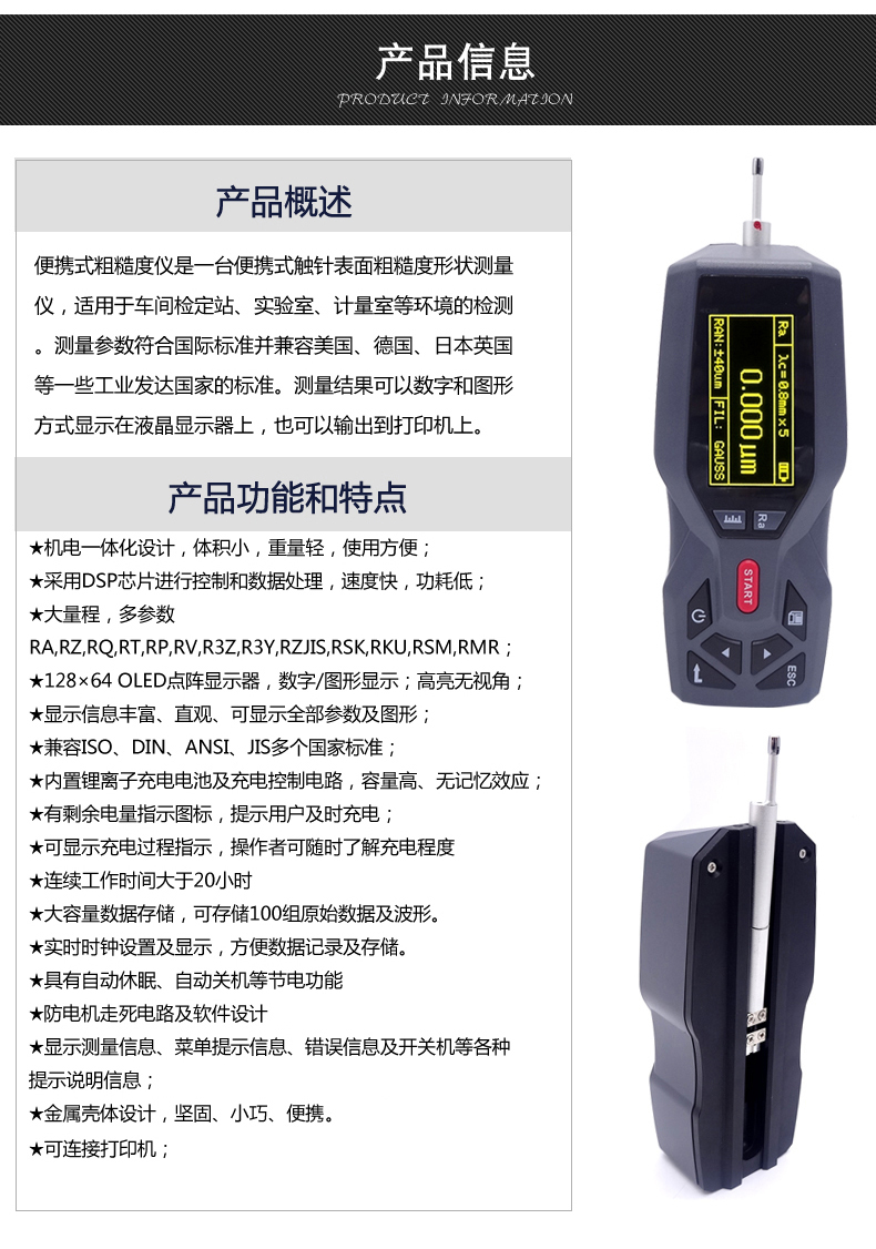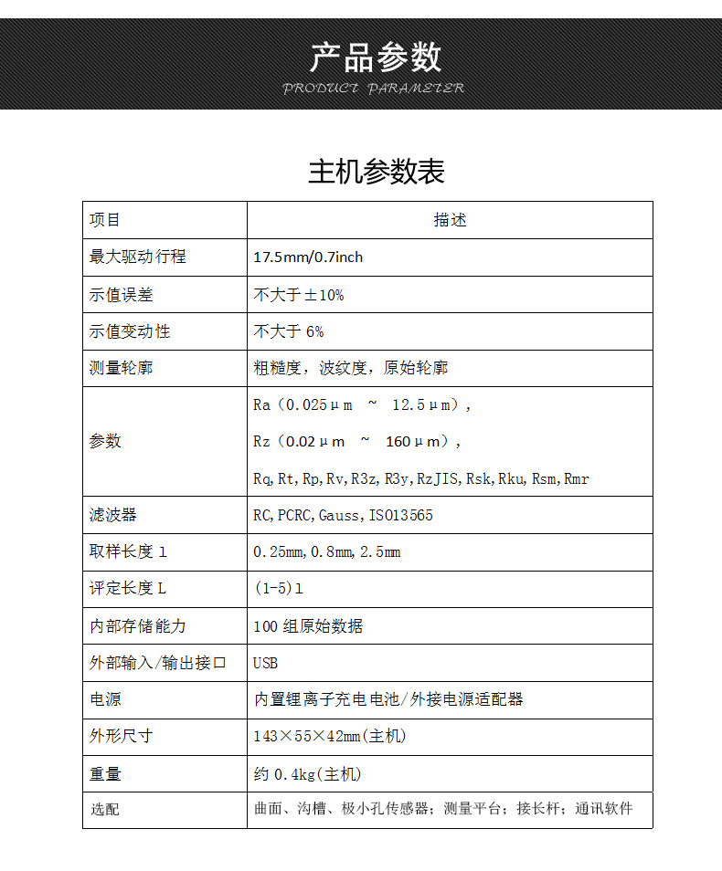 大量程,多參數Ra,Rz,Rq,Rt,Rp,Rv,R3z,R3y,RzJIS,Rsk,Rku,Rsm,Rmr;