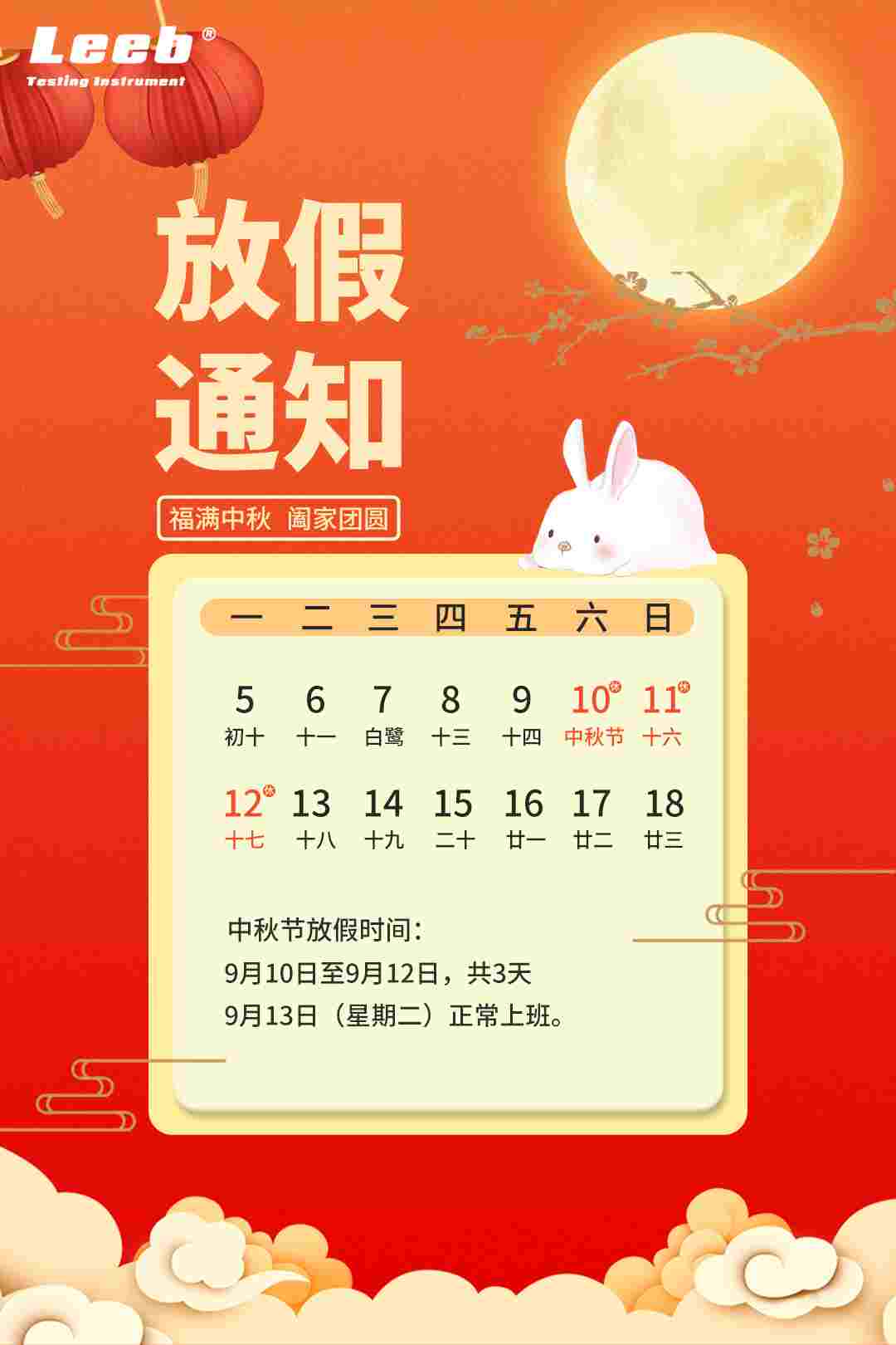 中秋節放假時間:9月10日至9月12日,共3天。9月13日(星期二)正常上班。放假期間,公司正常接單,在9月13號陸續發貨。